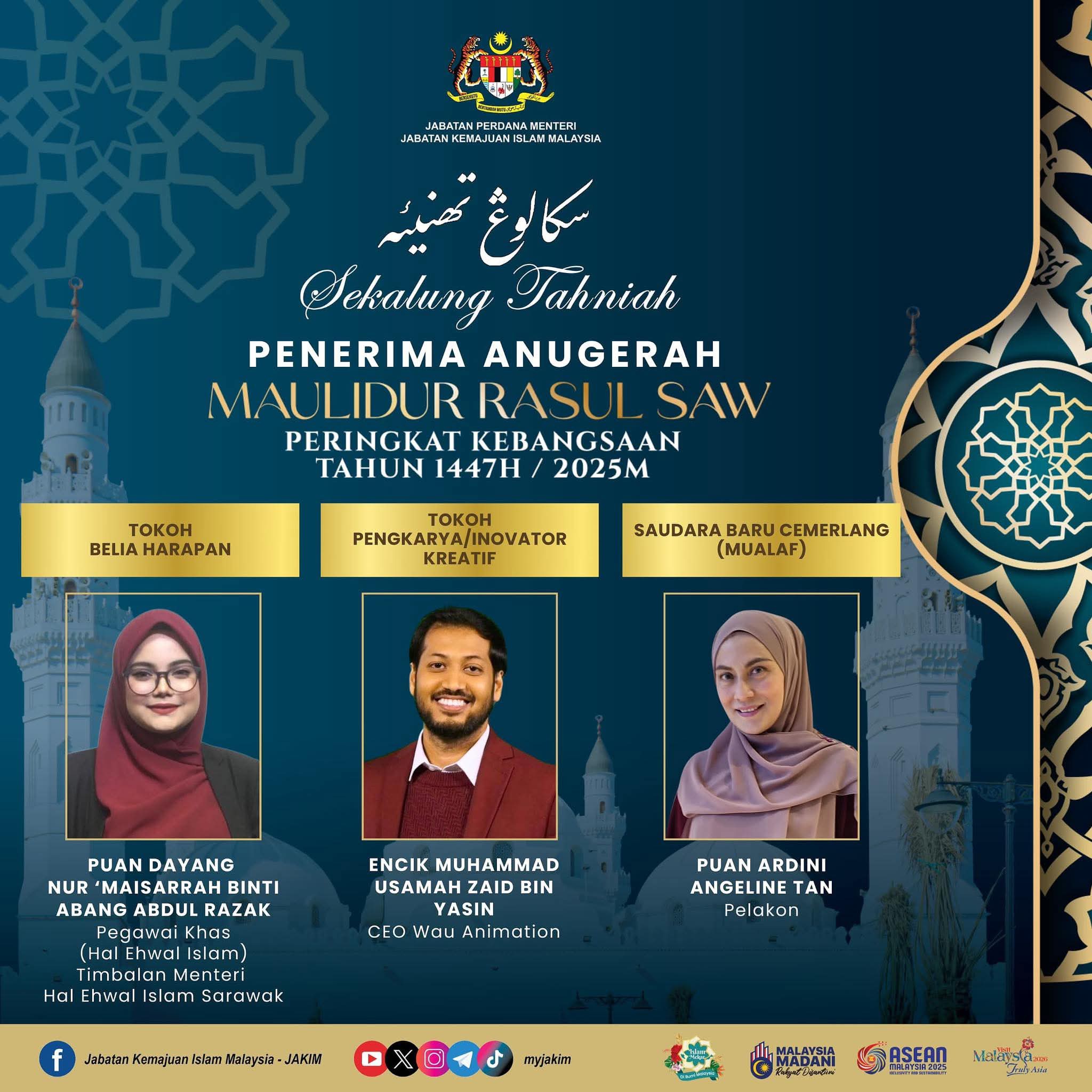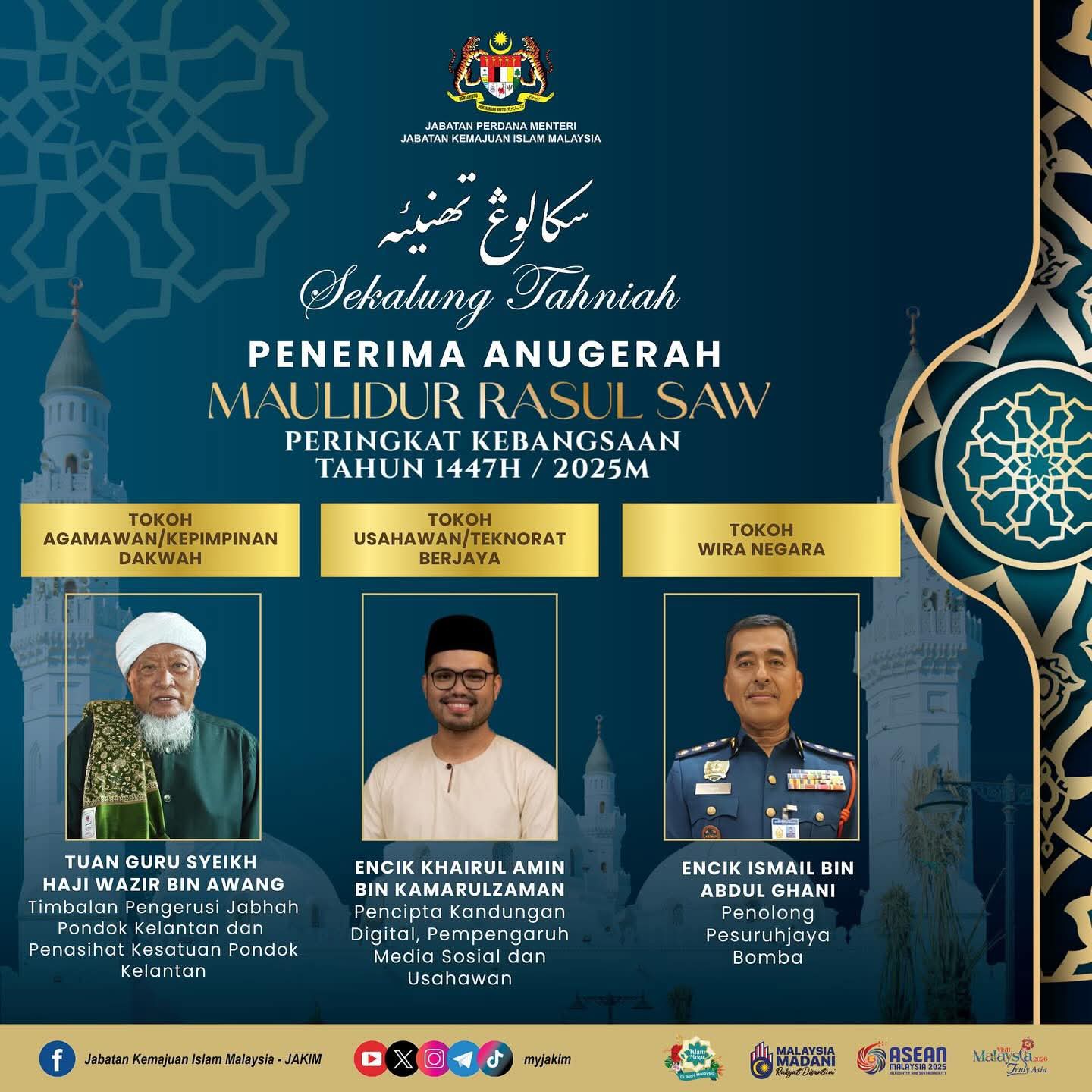 SERDANG, 4 Sept – Pencipta kandungan digital dan usahawan terkenal, Khairul Amin Kamarulzaman, 33, dipilih sebagai penerima Anugerah Maulidur Rasul Kategori Usahawan/Teknokrat Berjaya sempena Sambutan Maulidur Rasul SAW Peringkat Kebangsaan 1446H/2025M hari ini.