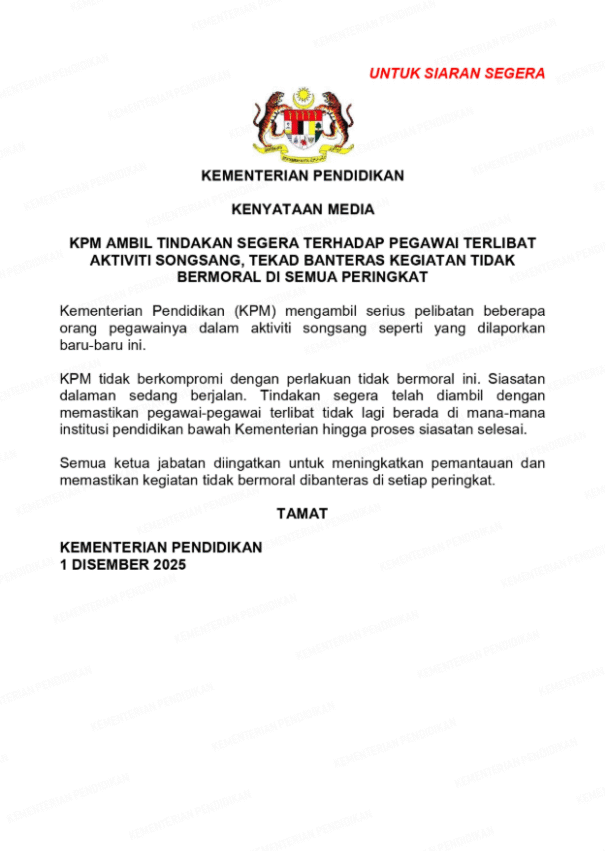 Kementerian Pendidikan Malaysia (KPM) akhirnya bersuara selepas tularnya serbuan di sebuah pusat spa dan kesihatan di Chow Kit Jumaat lalu yang membawa kepada penahanan lebih 200 individu, termasuk penjawat awam. KPM dalam satu kenyataan mengesahkan beberapa pegawainya antara yang terbabit — dan tindakan tegas terus diambil.