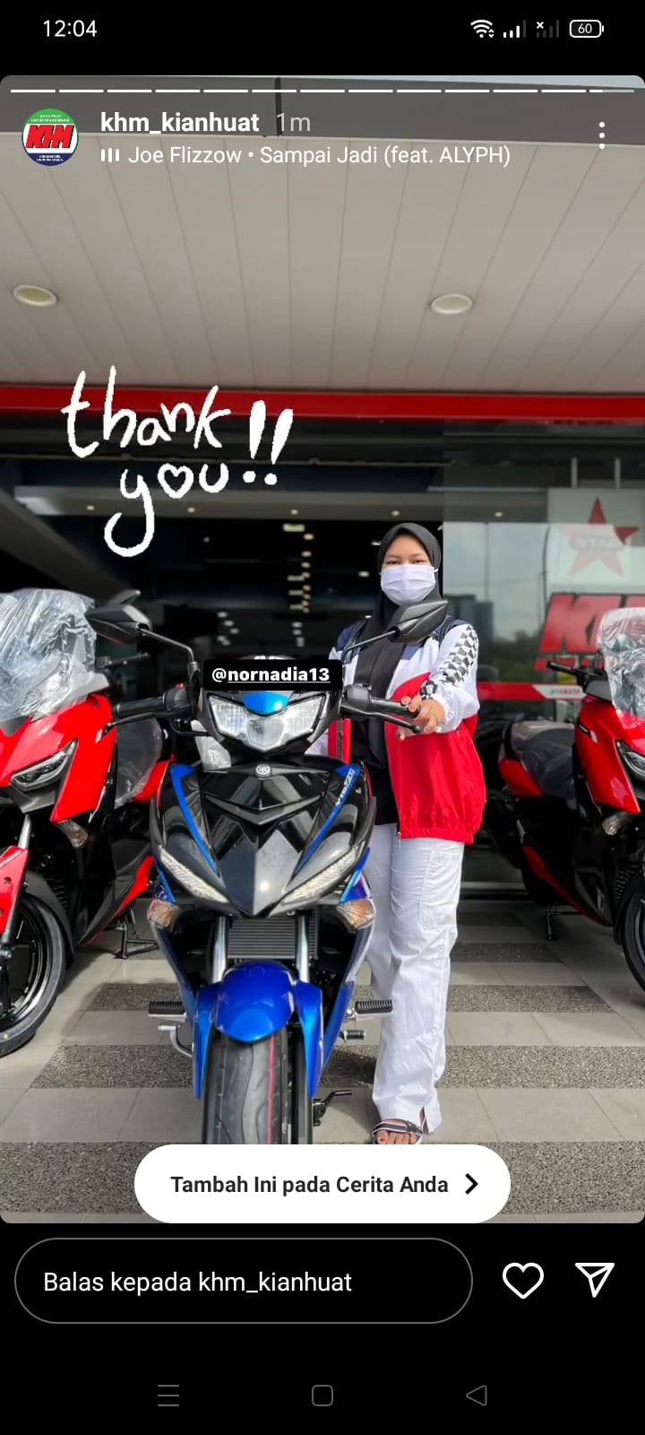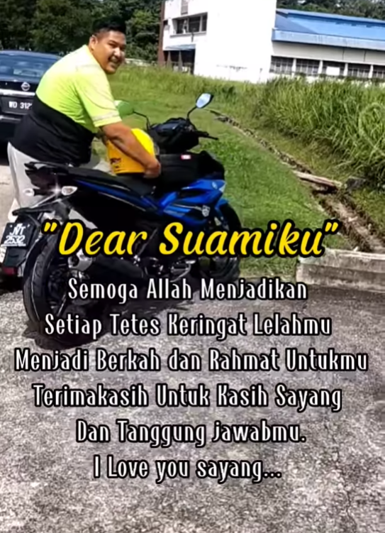 “Tak apalah, hari ini isteri awak tunaikan impian awak selama ini. Anggaplah hadiah ini kerana menjaga keluarga kita dengan baik, jalankan tanggungjawab tanpa mengeluh dan sabar melayan kerenah isteri ni,” tulisnya ketika menghadiahkan motosikal tersebut kepada suami tercinta.