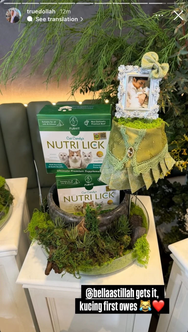 Sementara itu, pihak Bella pula membalas dengan tujuh dulang hantaran termasuk set minyak wangi, makanan kucing dan beberapa hadiah lain.