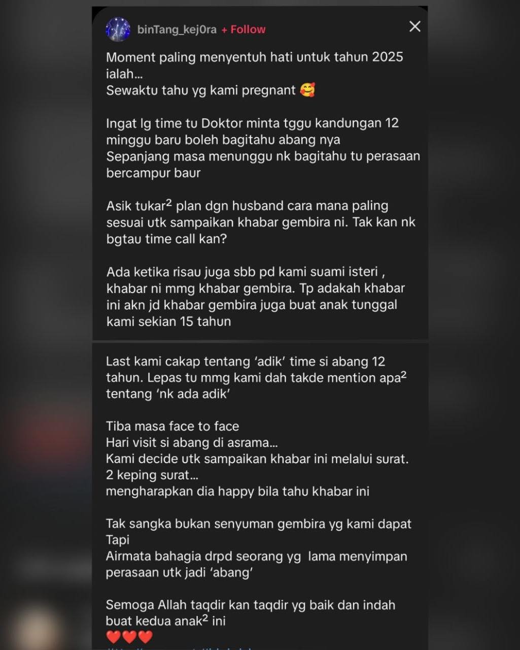 Menurut perkongsian yang tular di media sosial, pasangan tersebut sudah lama menantikan kehadiran cahaya mata kedua. Namun mereka memilih untuk menunggu sehingga kandungan mencecah 12 minggu sebelum berkongsi berita gembira itu dengan anak mereka yang kini berusia 15 tahun.